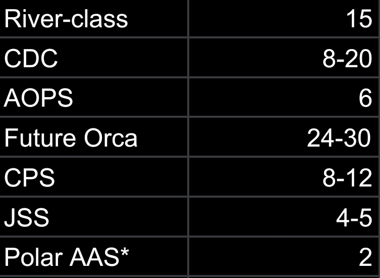 AOPS: Refers to the Arctic and Offshore Patrol Ships. The two planned for the Coast Guard are not included